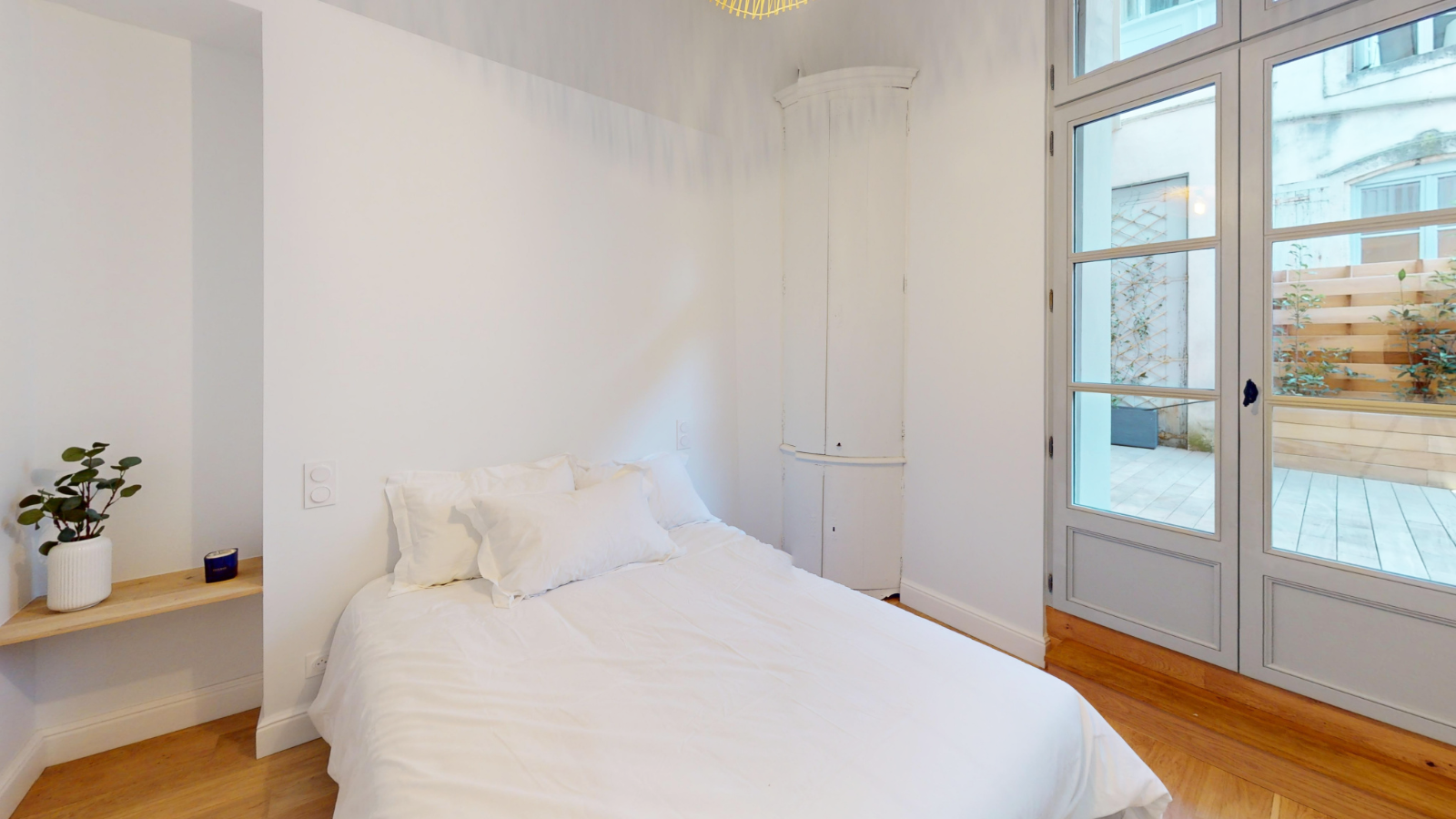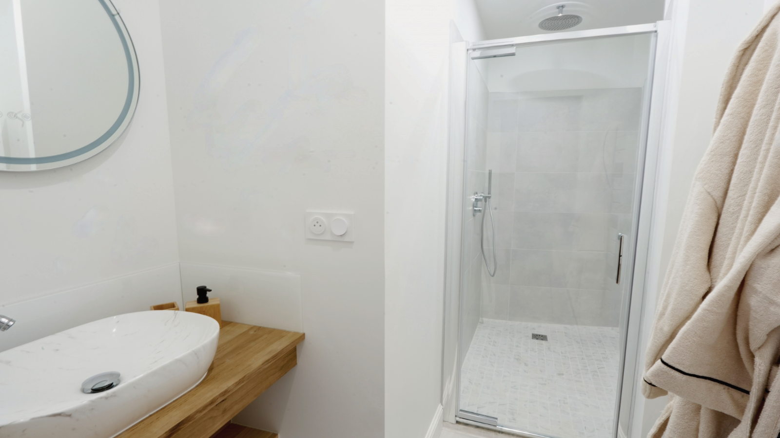 Le T4 propose une configuration différente. Son entrée se fait depuis la cour de l’immeuble, avec un SAS couvert qui offre un premier espace de transition. Dès l’entrée, un espace permet de se changer et de s’asseoir, avant de déboucher sur un couloir agrémenté de rangements menant aux trois chambres. Chacune dispose de sa propre salle d’eau privative et de rangements. La première chambre bénéficie d’une porte cochère ancienne, conservée et restaurée, apportant du cachet à cette pièce. Cette circulation mène à un grand séjour avec cuisine ouverte, offrant une belle hauteur sous plafond, mise en valeur par des moulures existantes ainsi qu’une cheminée également conservée. Un endroit a été soigneusement choisi pour mettre en valeur la pierre des murs et ainsi apporter de l’authenticité à l’ensemble. Le salon, partiellement ouvert sur la salle à manger, crée un espace plus intimiste tout en étant largement ouvert sur une grande terrasse en bois de 55 m². Grâce à de grandes baies vitrées, le séjour est inondé de lumière et offre une vue dégagée sur l’extérieur.