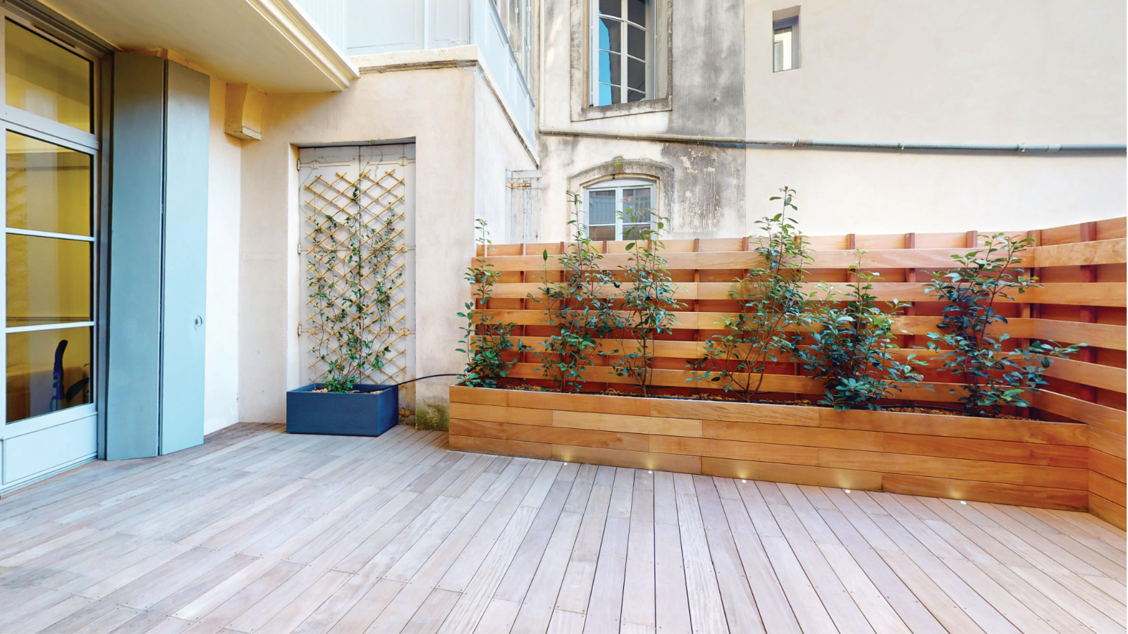 Le T3 s’ouvre sur un espace d’entrée qui offre à la fois un rangement et une assise, permettant ainsi d’intimiser le salon tout en évitant une ouverture directe sur celui-ci. Le beau salon, avec une ancienne cheminée conservée, s’ouvre largement sur une grande terrasse en bois de 34 m². Il communique également avec un espace repas et la cuisine, cette dernière disposant d’un cellier/rangement. Un couloir, aménagé de rangements, mène à une salle d’eau avec WC ainsi qu’à deux chambres indépendantes, chacune équipée d’un dressing intégré. Ces deux chambres s’ouvrent également sur la terrasse de l’appartement.